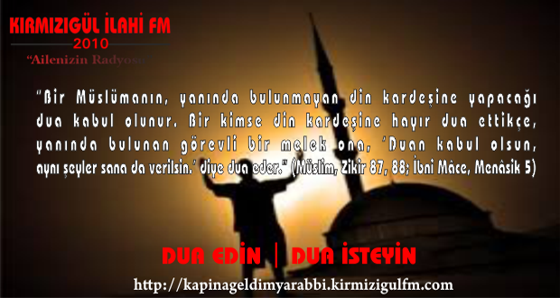 esselamu aleykum değerli ziyaretçilerimiz ve dinleyenlerimiz. Uzun zamandan buyana facebook sosyal ağ platformunda Kapına Geldim Yarabbi sayfamızdan isme özel dua paylaşımları yaptık ve yapmayada devam edeceğiz. Bu hizmetimizle birlikte internet adresimiz olan http://www.kapinageldimyarabbi.kirmizigulfm.com adresimizdede bu paylaşımları yaparak daha çok kitleye ulaşarak dua kardeşliğimizi büyütmeye ve güçlendirmeye çalışacağız. Bana dua edin duanızı kabul edeyim buyuran Yüce Rabbimizin dualarını kabul ettiği kardeşlerimizin sayısını arttıracağız inşAllah. Tabi bu konuda sizlerinde desteğinize ihtiyacımız var bizim ulaşamadığımız ama sizin ulaşabildiğin kişileri davet ederek dua kardeşliğine dahil etmeniz ve bu konuda pay sahibi olmanızı istiyoruz. Rabbimiz ümmeti Muhammed’in duasını kabul buyursun, maddi ve manevi sıkıntılarını bertaraf eylesin inşAllah. selam ve dua ile.